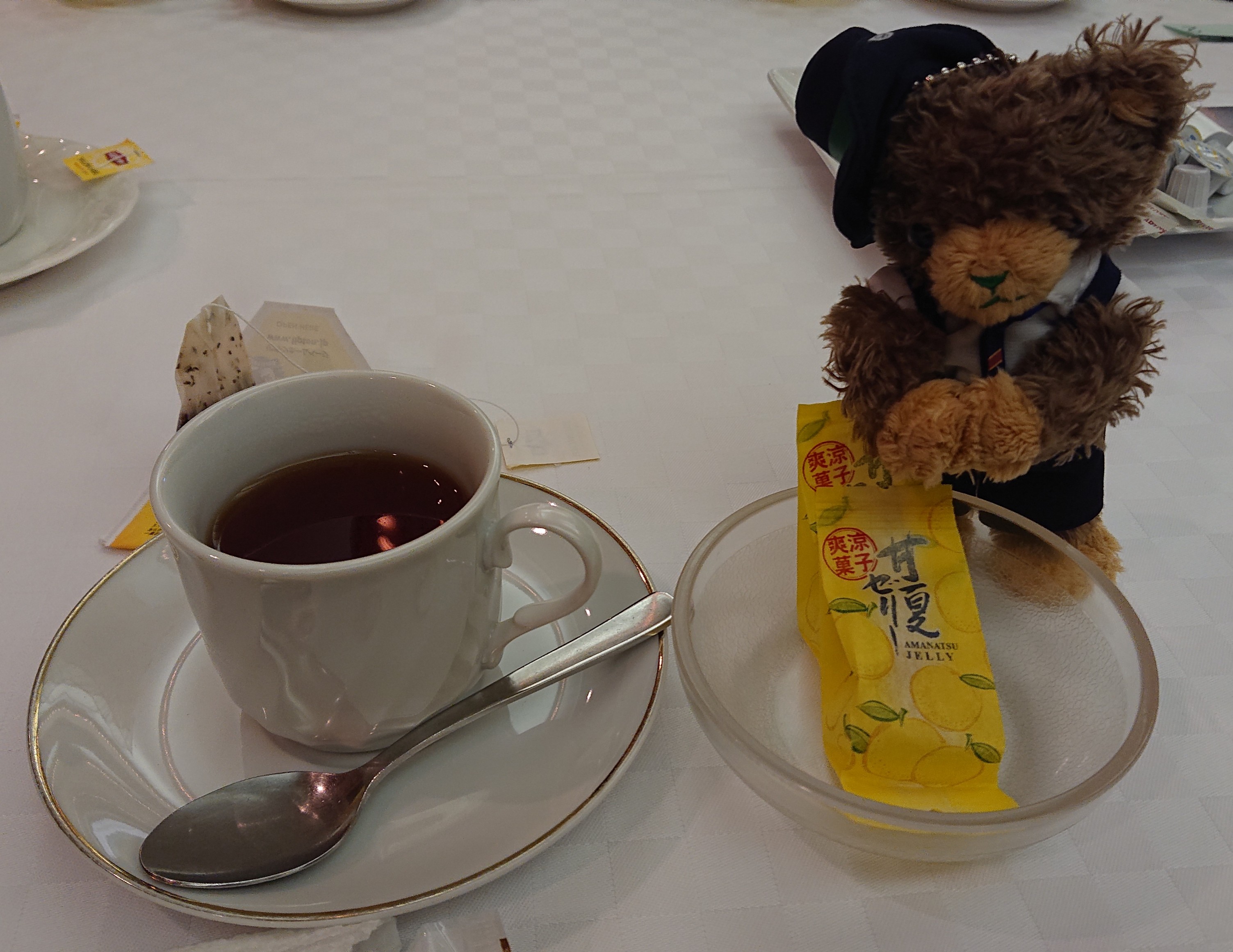 食後のデザートに甘夏ゼリーとお紅茶が出た。